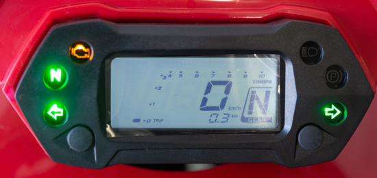 A kéken világító műszerfal áttekinthető és leolvasható többfunkciós LCD-kijelzővel minden fontos információt közöl: digitális sebességmérő, digitális fordulatszámmérő, kilométerszámláló, napi kilométerszámláló, kilométerszámláló, digitális üzemanyagszint-mérő. Vannak jelzőfények a sebességfokozathoz, az üresjárathoz, a hátramenethez és a távolsági fényszórókhoz.
